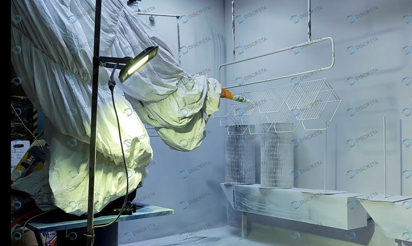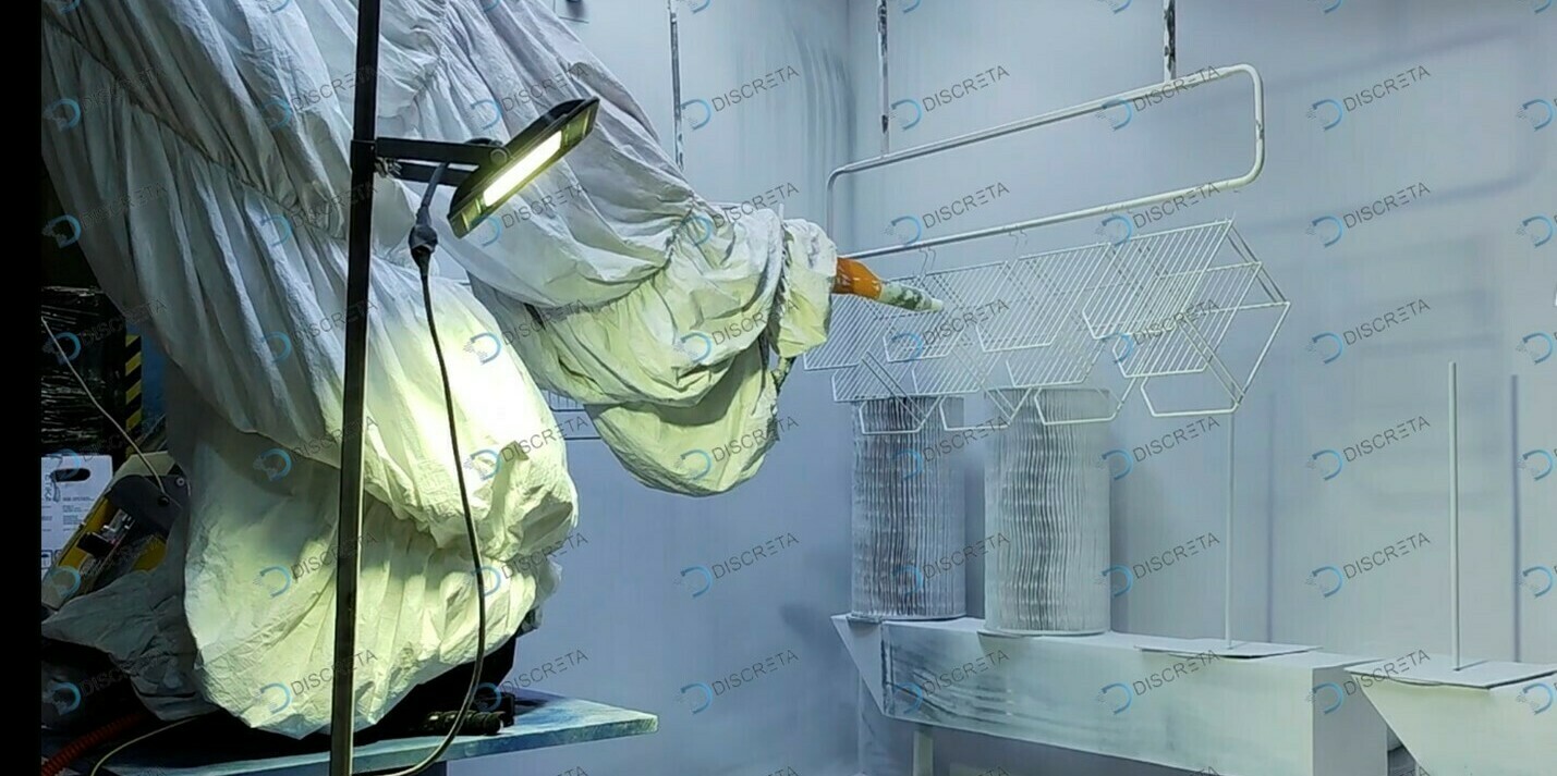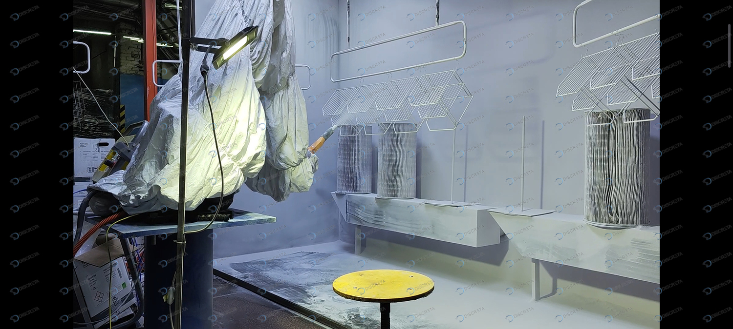 В основу покрасочной ячейки заложен робот FANUC M-10iD/10l. В рамках проекта была реализована система автоматизированной покраски с возможностью смены покрасочного оборудования. Ячейка оснащена панелью оператора для быстрой и удобной смены управляющей программы и внесения необходимых изменений в настройки робота, а также программирования и корректировки покрасочных траекторий.