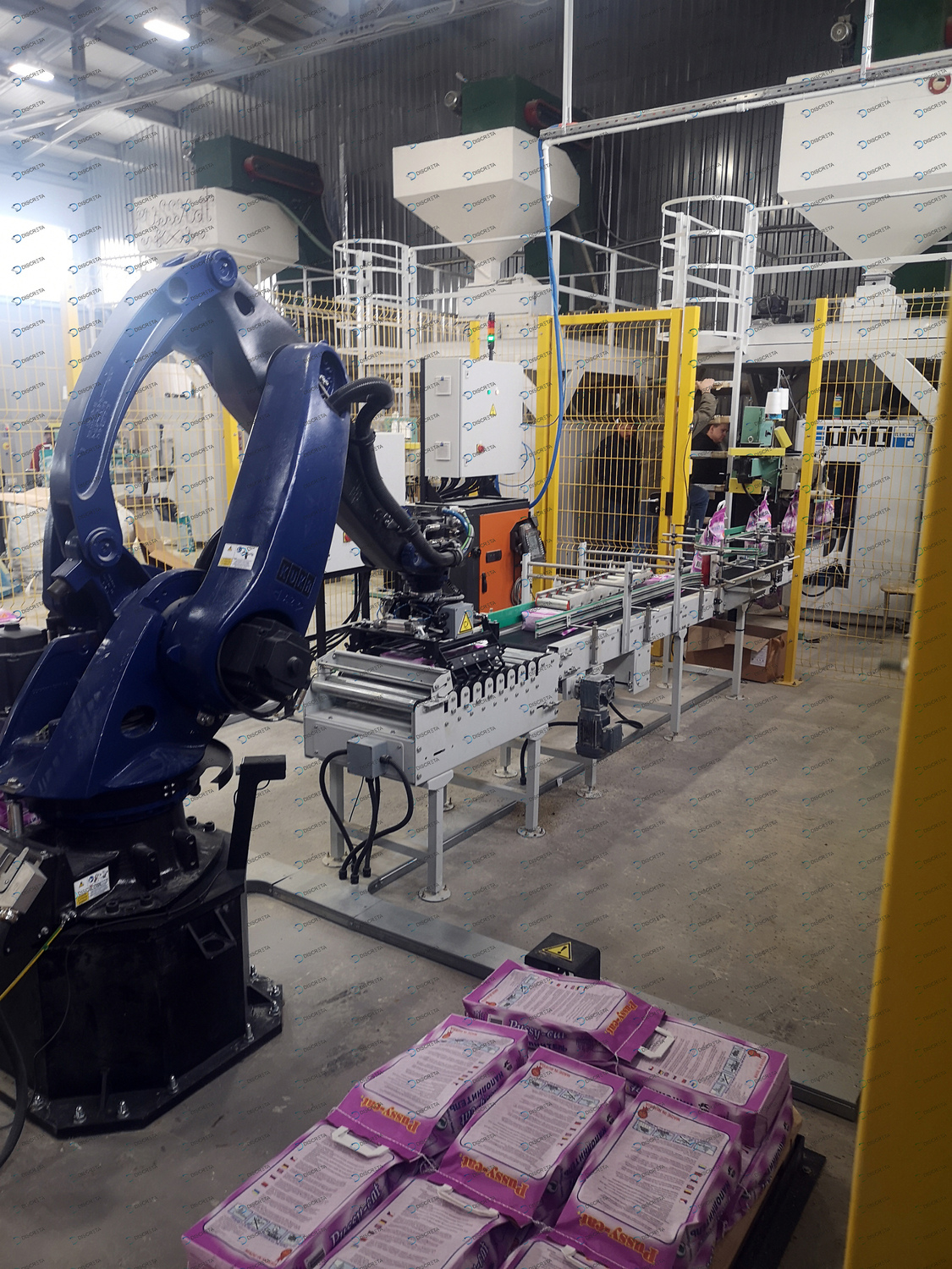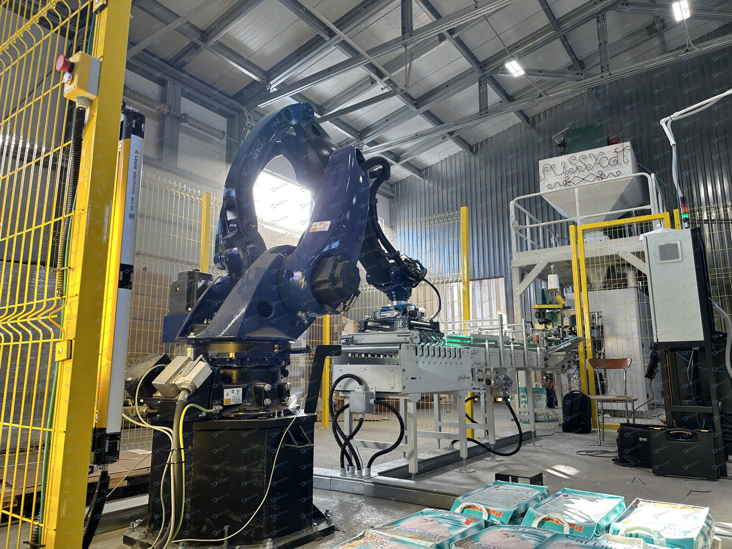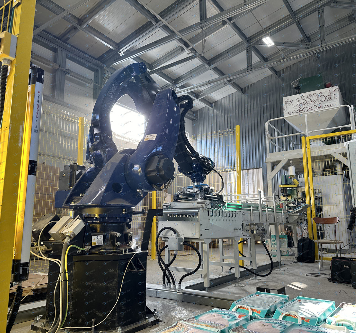 Комплекс паллетирования мешков с кошачьим наполнителем. Скорость до 720 шт/час. Автоматическое выравниванием мешка на конвейере, автоматическое распределение материала внутри мешка без повреждения упаковки.