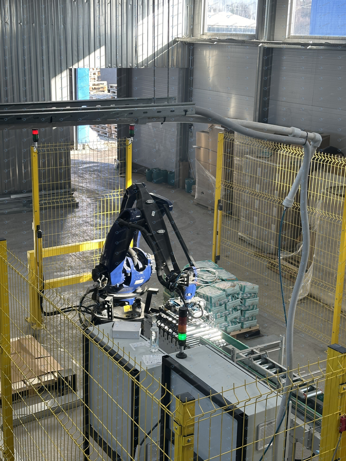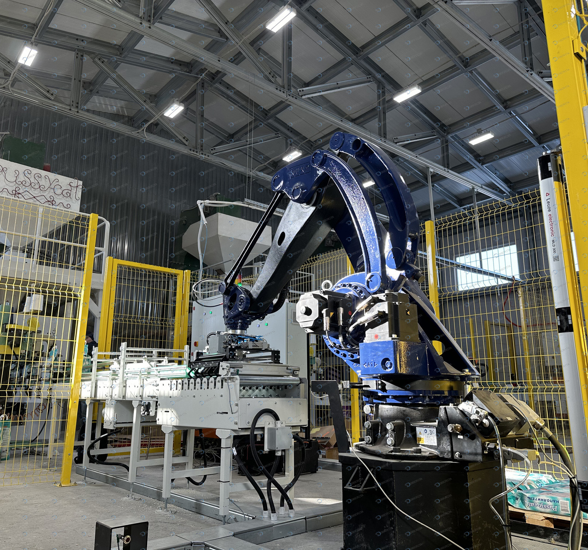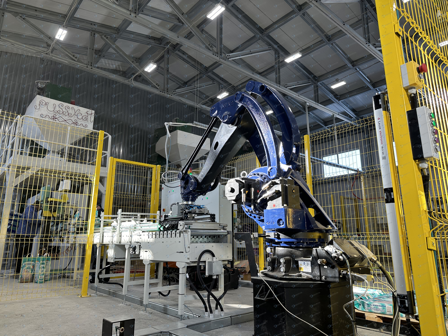 Комплекс паллетирования мешков с кошачьим наполнителем. Скорость до 720 шт/час. Автоматическое выравниванием мешка на конвейере, автоматическое распределение материала внутри мешка без повреждения упаковки.