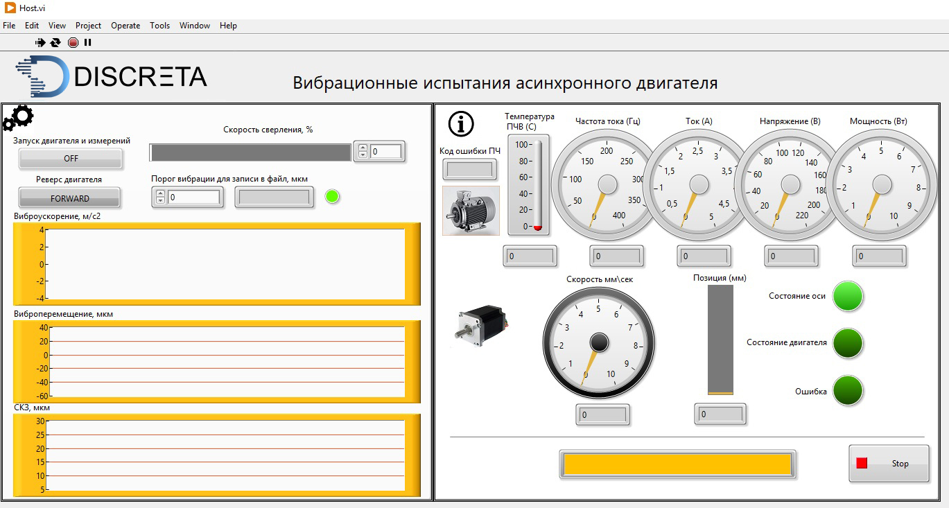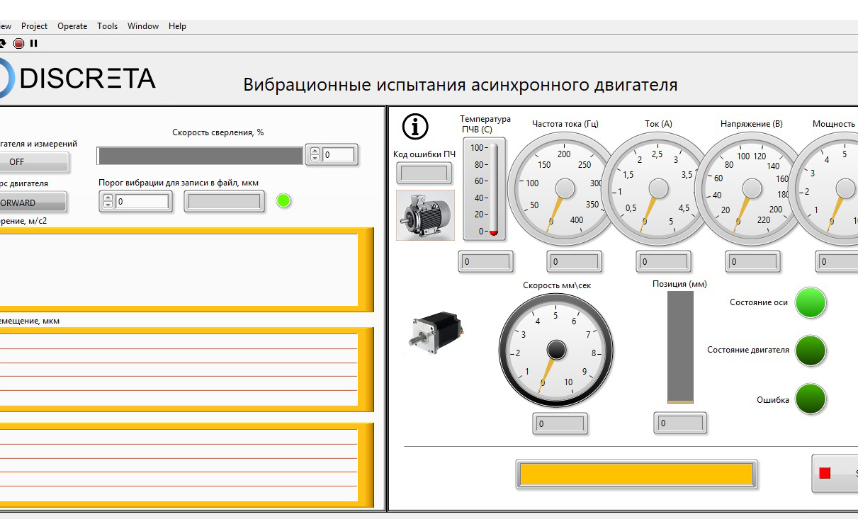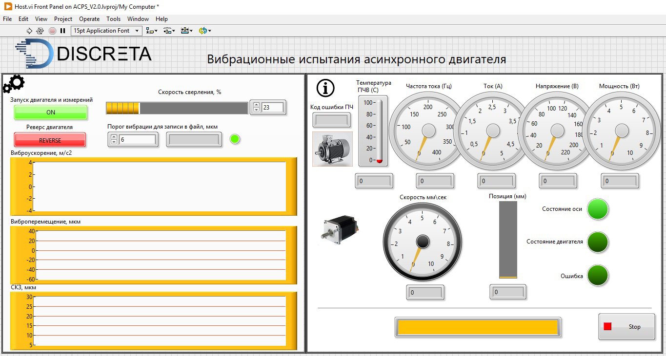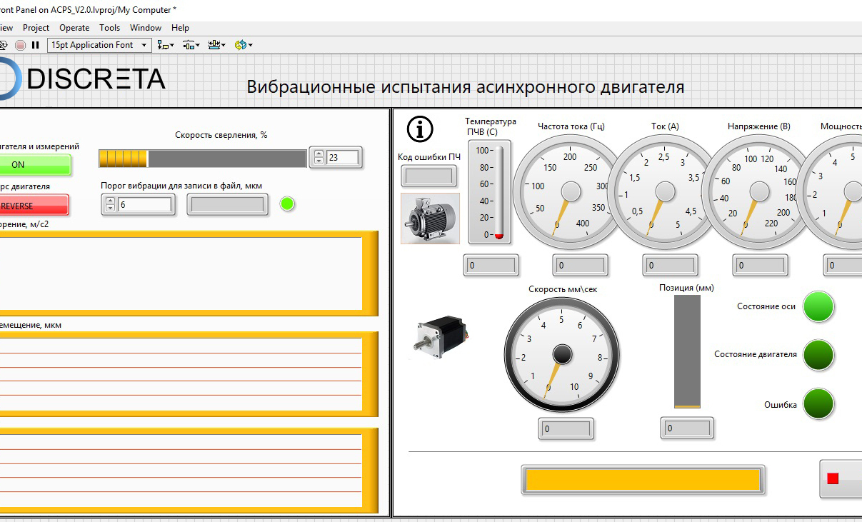 Программное обеспечение для установки вибрационных испытаний асинхронных двигателей в работе. Сбор данных с 3-осевых акселерометров. Расчет виброускорения, виброскорости и виброперемещения. Сбор данных о температуре двигателя, времятоковых характеристик. Логирование данные. Отображение на лицевой панели блокировок и аварий.