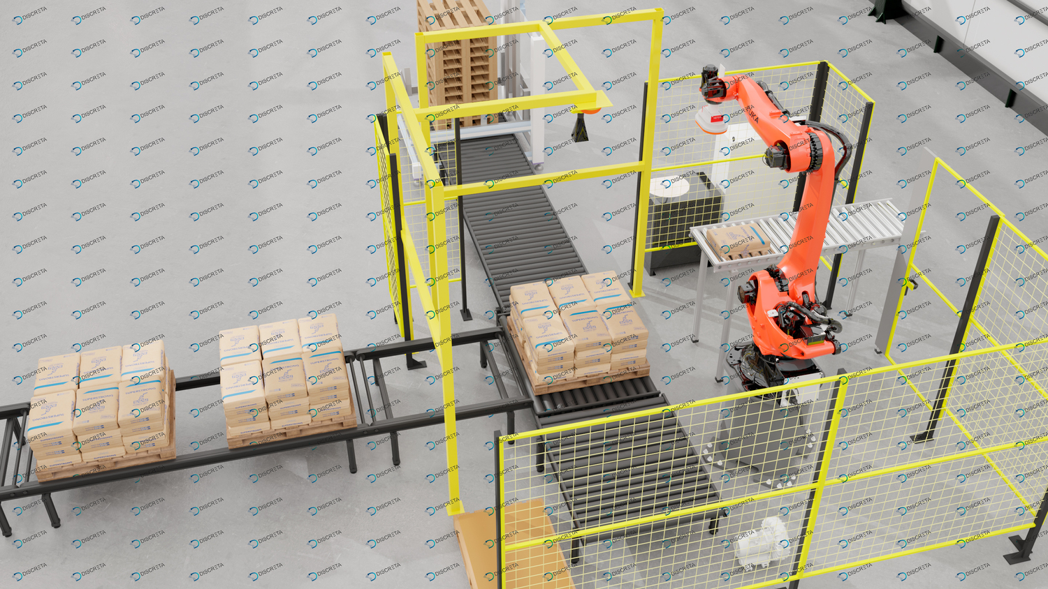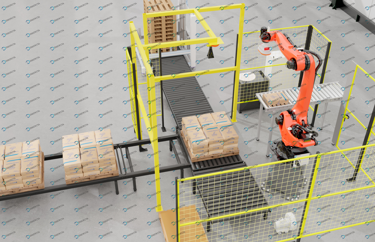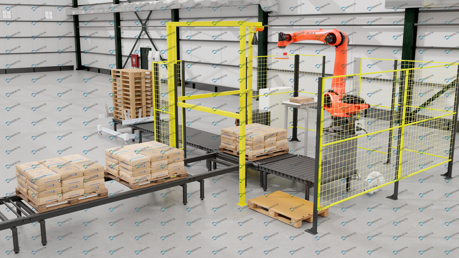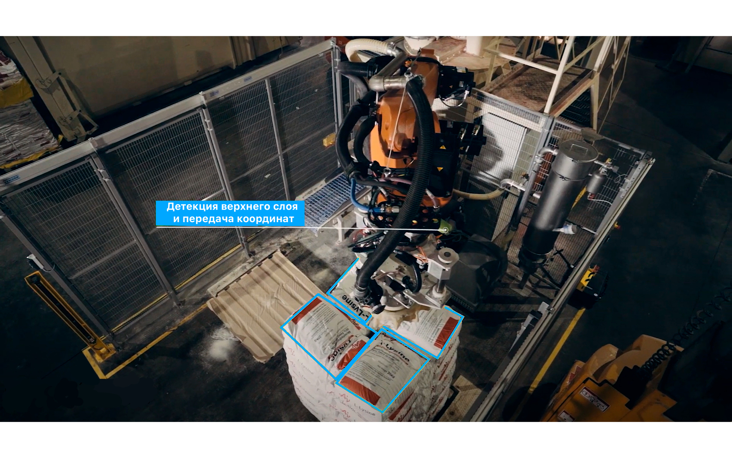 Роботизированный комплекс депаллетирования мешков 50 кг на паллете. Скорость 350 мешков в час. Система технического зрения сканирует паллету с продуктом и передает координаты роботу для захвата и укладки на приемный конвейер. Сокращение тяжелого труда грузчиков, уменьшение производственной площади, занятой под депаллетизацию, ускорение деполитизации до 3х раз. Подобные системы используются также для растарки сырья.