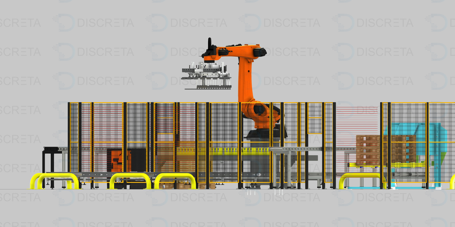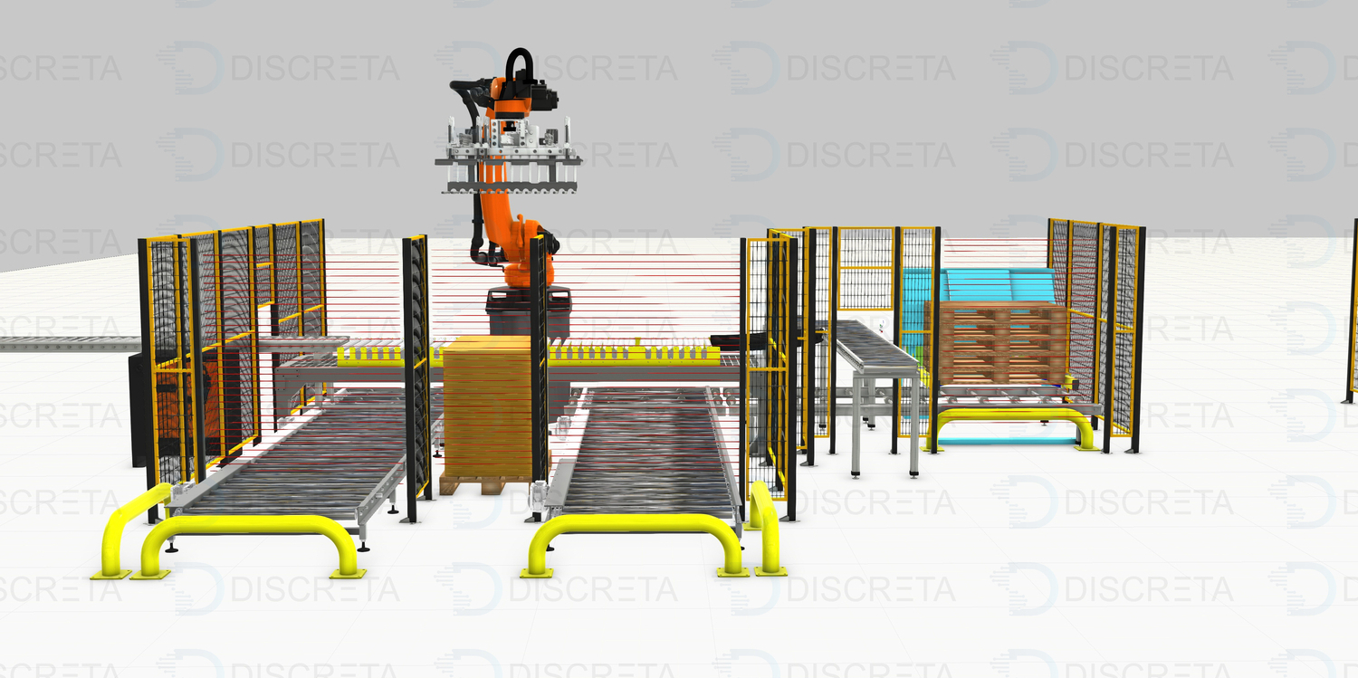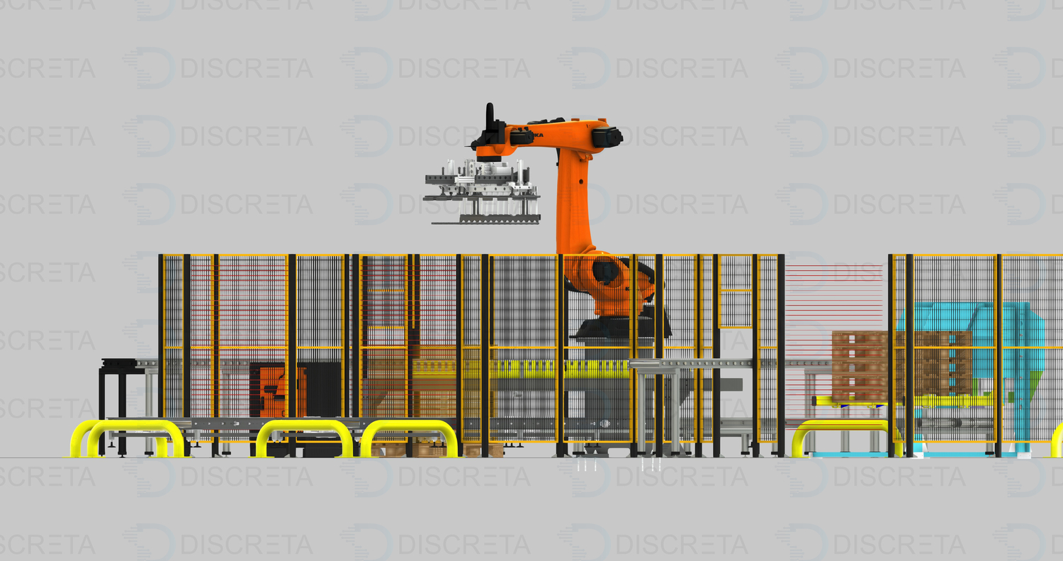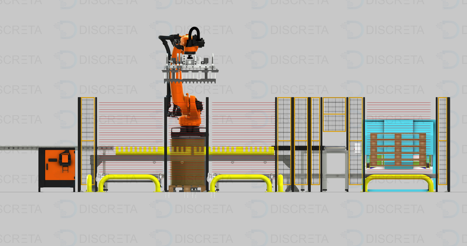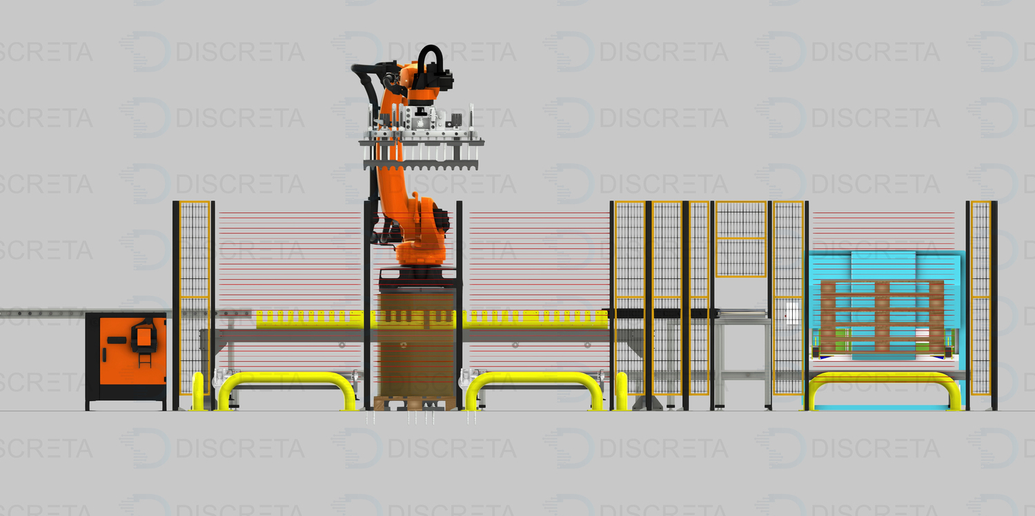 Позволяет реализовать полную автоматизацию процесса паллетирования коробок с продукцией. Человек пополняет только запасы прокладок и паллет. Паллета подается автоматически посредством диспенсера или устройства на захвате робота, которое позволяет перемещать их.