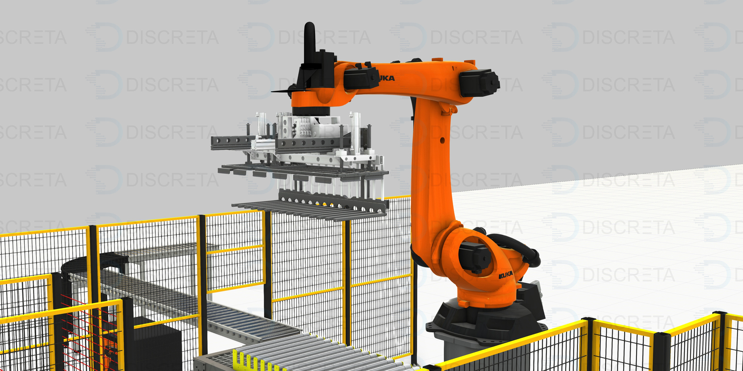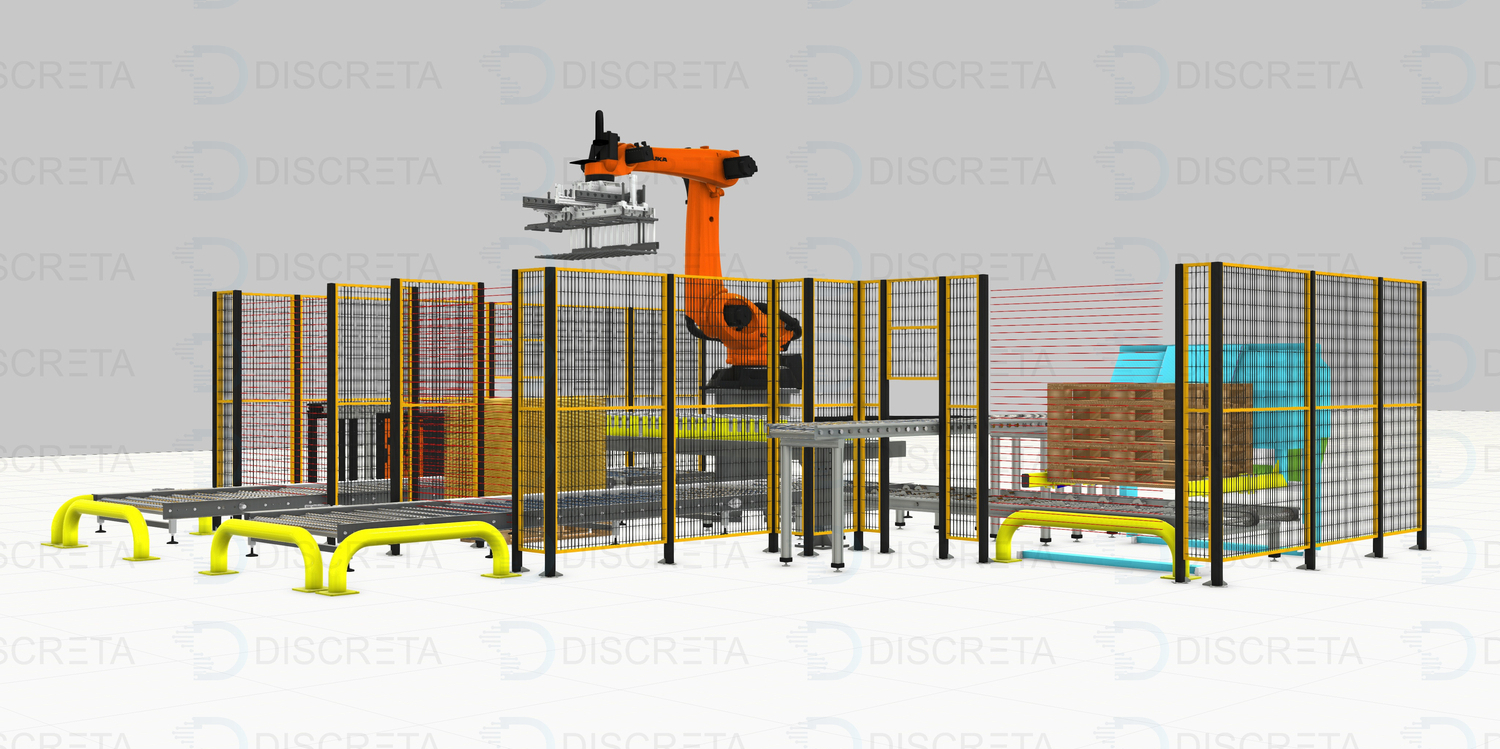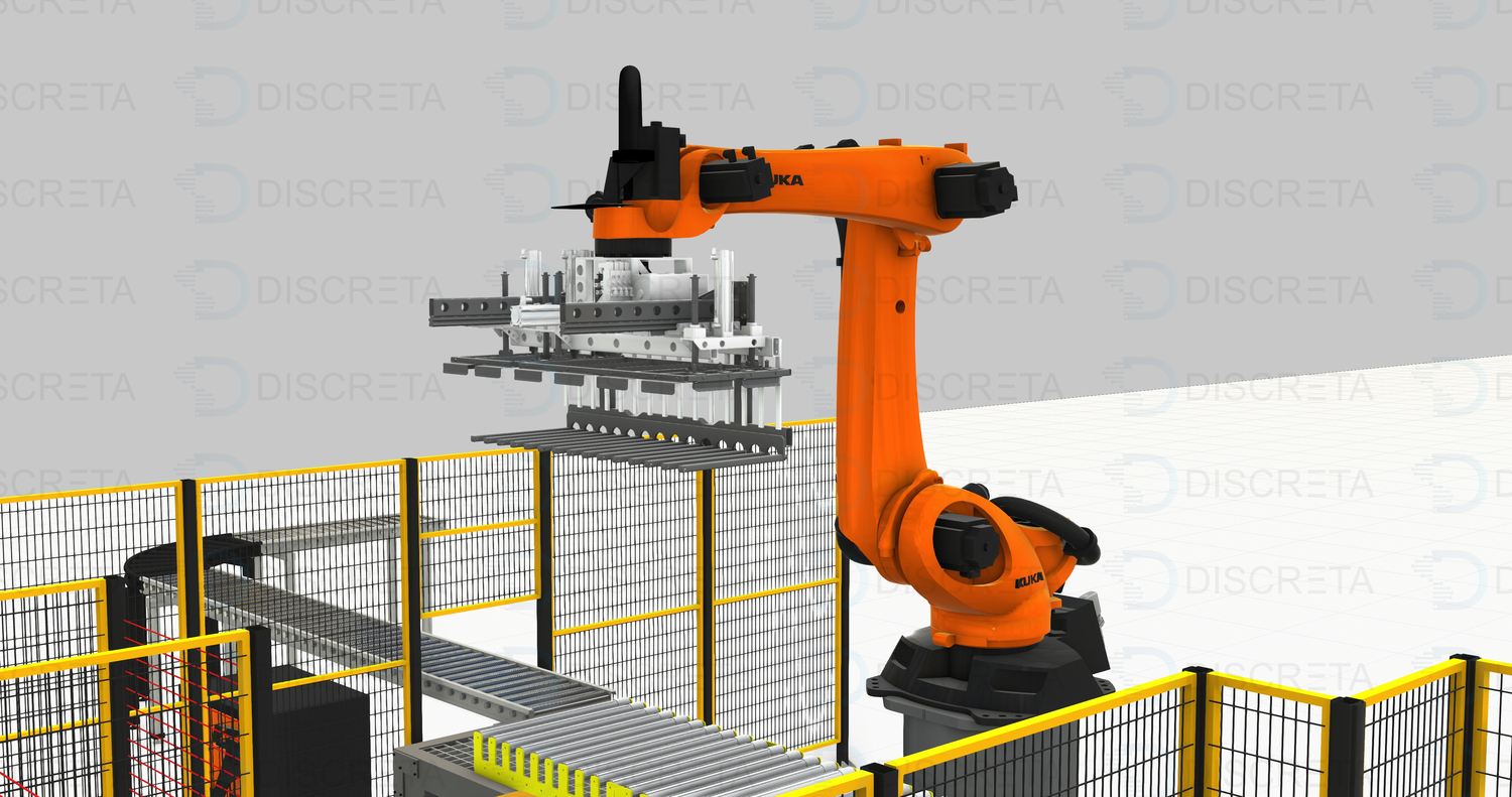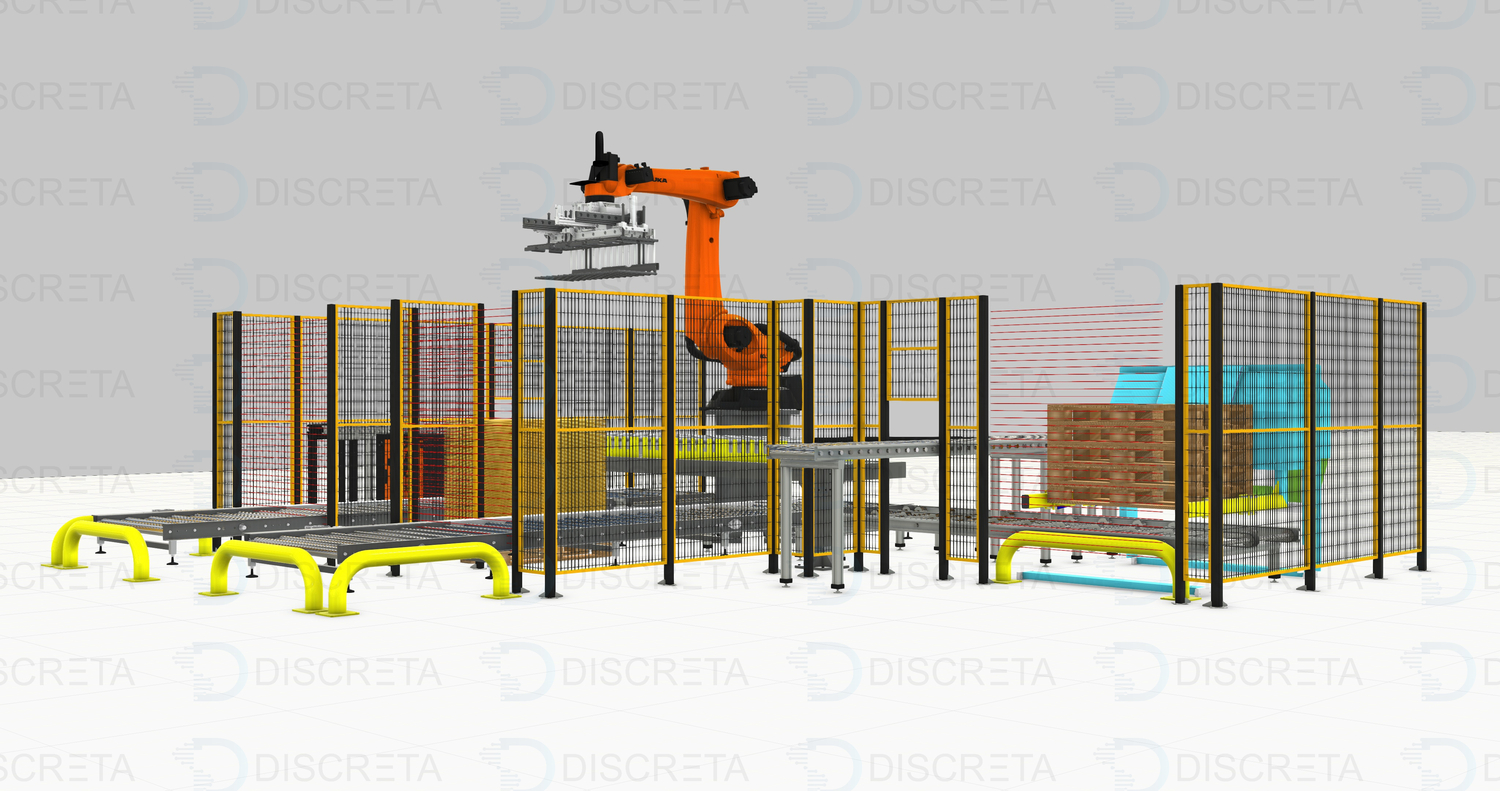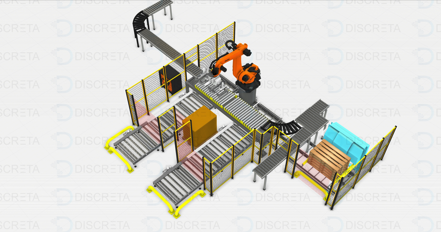 Позволяет реализовать полную автоматизацию процесса паллетирования коробок с продукцией. Человек пополняет только запасы прокладок и паллет. Паллета подается автоматически посредством диспенсера или устройства на захвате робота, которое позволяет перемещать их.