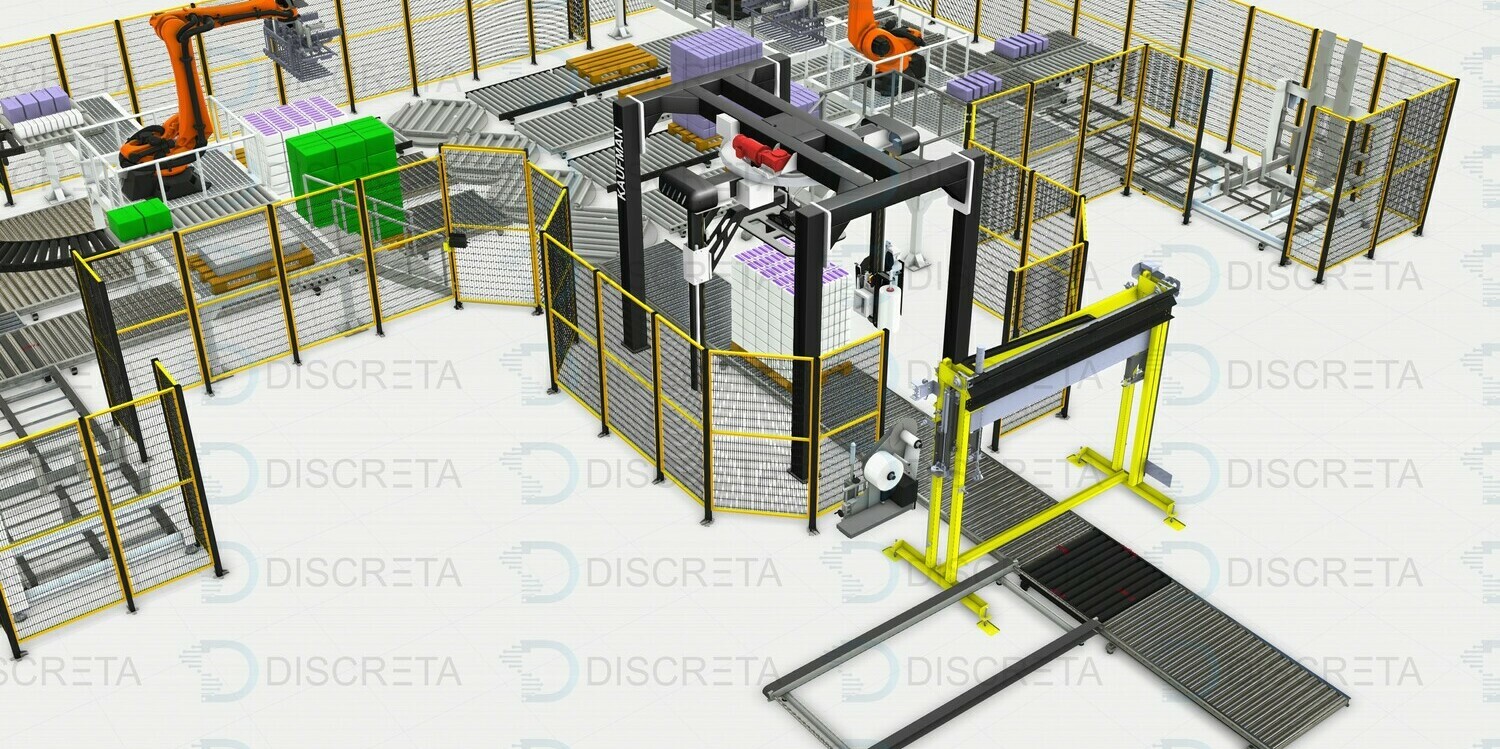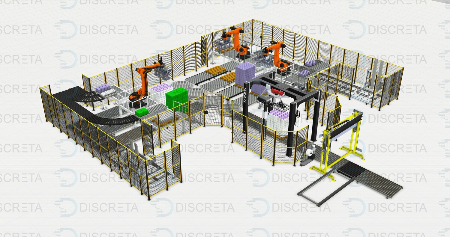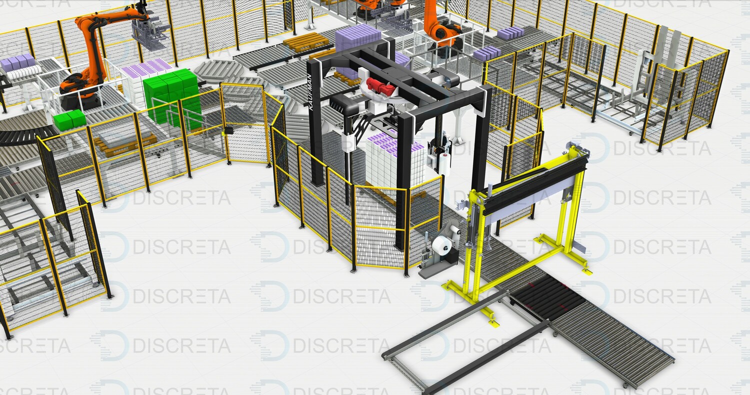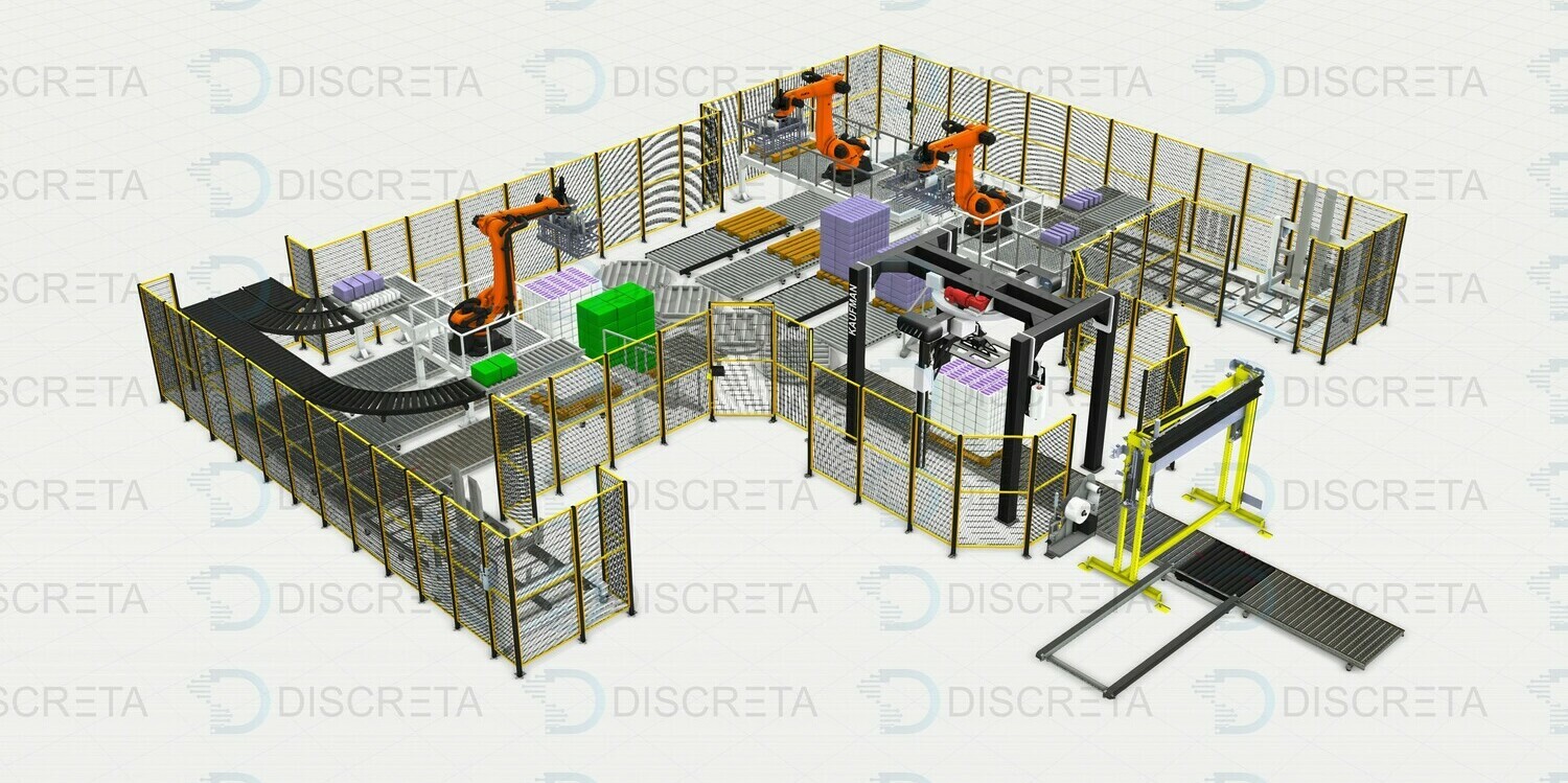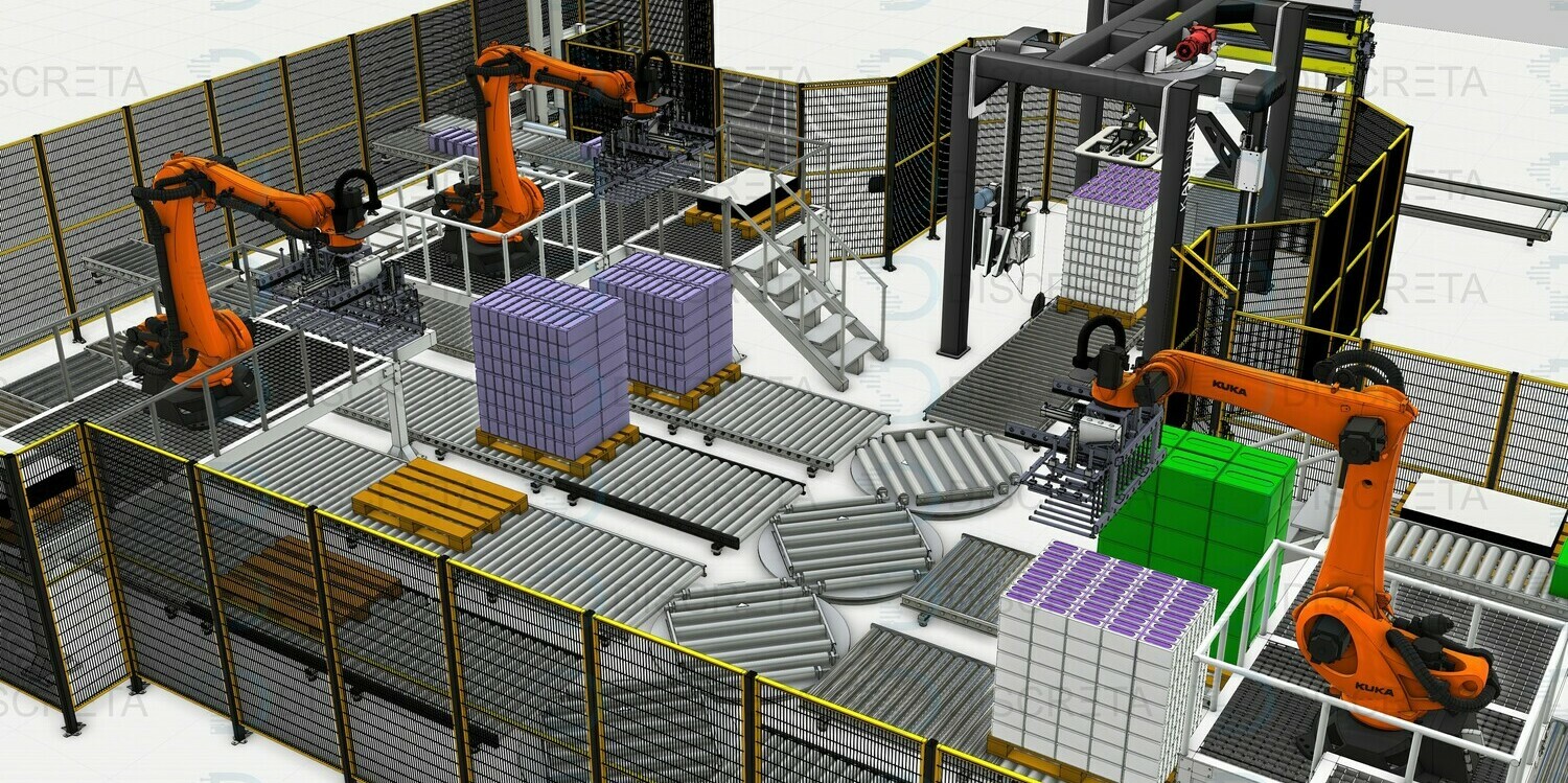 Паллетирование продукции в групповой упаковке позволяет собирать с различных линий продукцию одним или несколькими роботами с высокой производительностью захватывая сразу несколько упаковок роботом. Сортировка и поиск продукции на конвейере осуществляется системой датчиков или машинным зрением. Данные системы заменяют несколько человек в смену