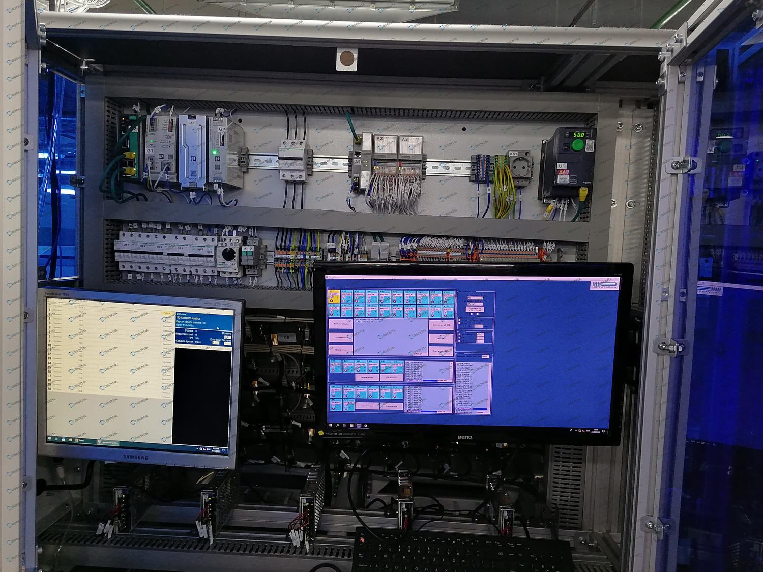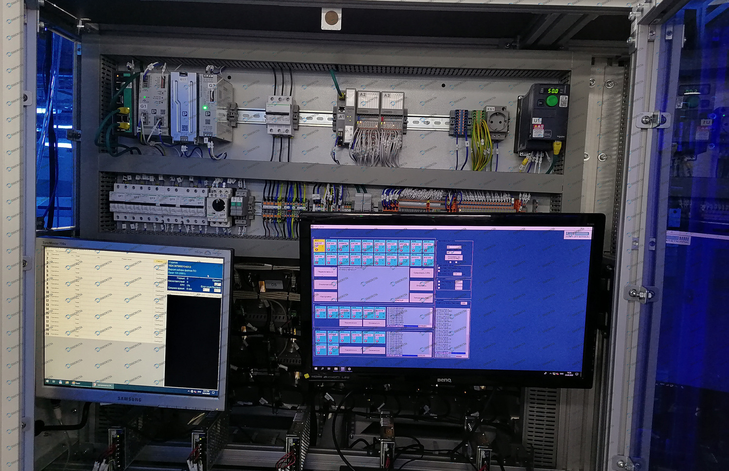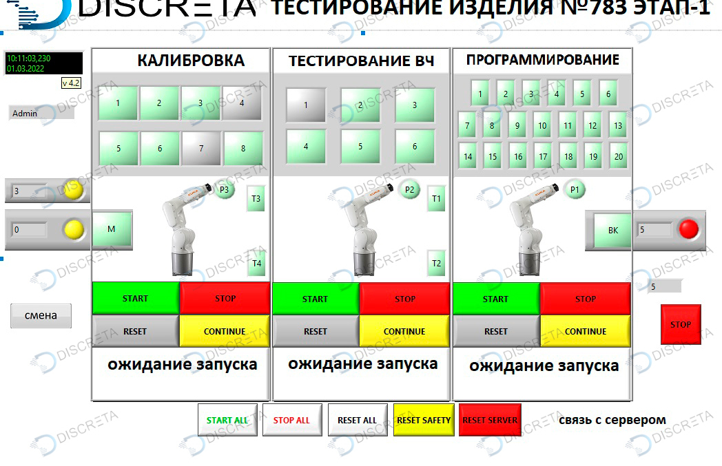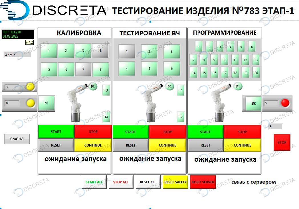 Программно-аппаратный комплекс программирования и тестирования электронных приборов. Реализована связь с системой прослеживаемости клиента, тестовым оборудованием, программаторами и системой управления оборудованием - промышленными роботами, конвейерными системами, контактными устройствами. Программное обеспечение в режиме реального времени контролирует состояние всех узлов, ведет журнал аварий, производит аутентификацию пользователя, выполняет регулирующие воздействия и связь с оборудованием заказчика.
