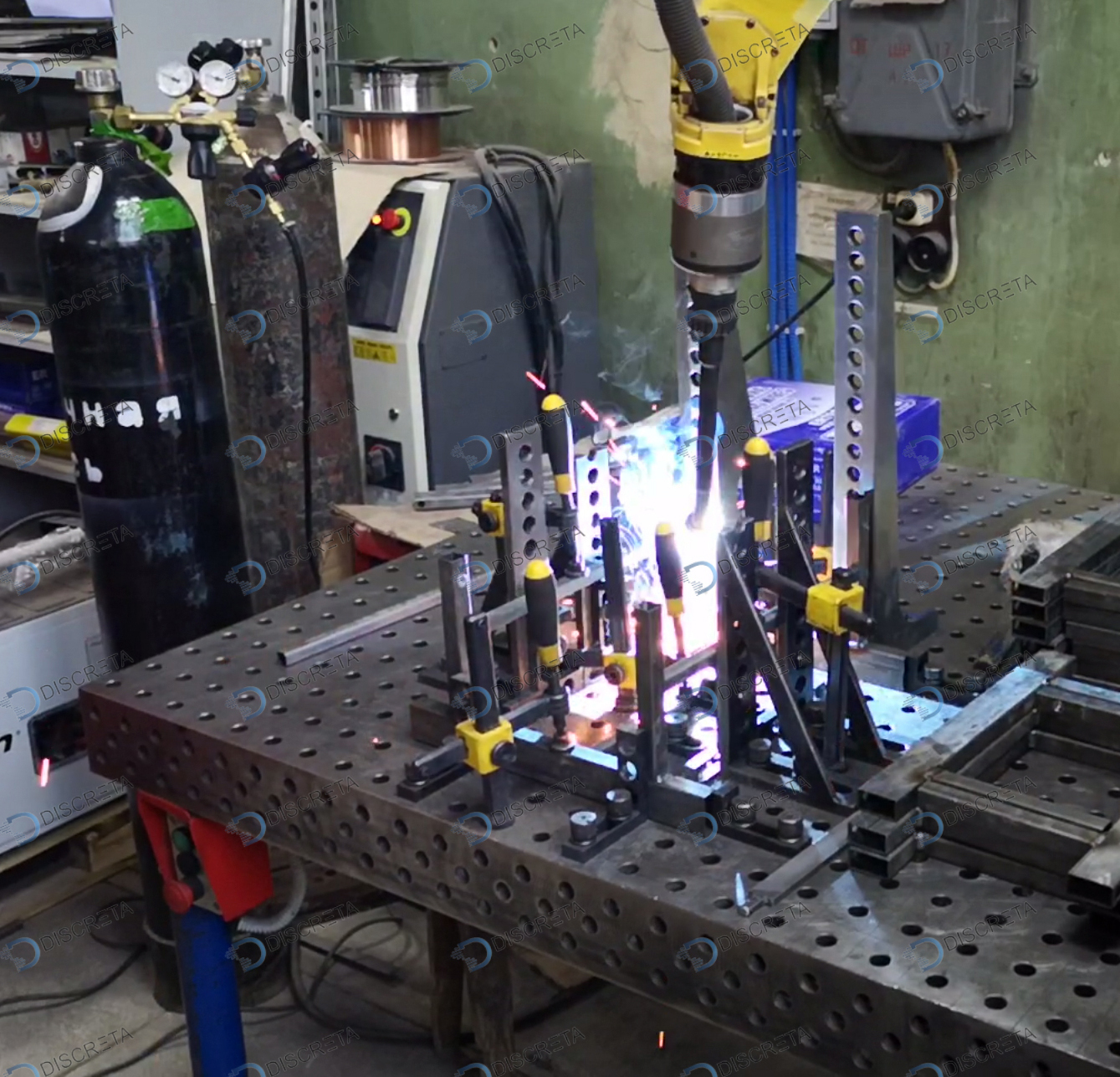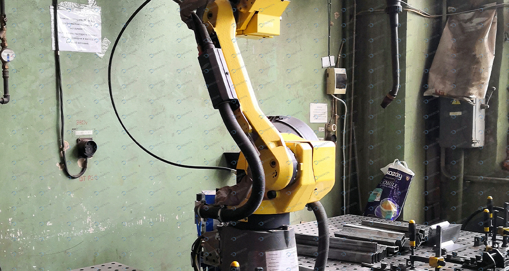 Построен на основе робота FANUC ARC Mate 100iC, сварочного источника Fronius, а также оборудования для очистки горелки Abicor Binzel.